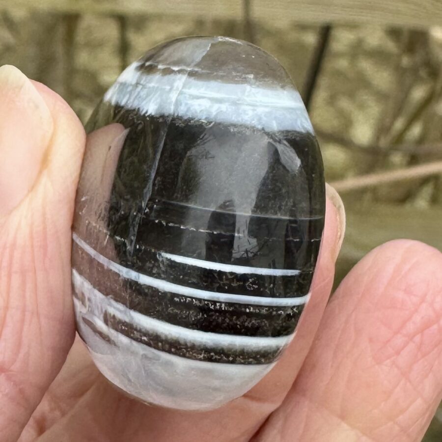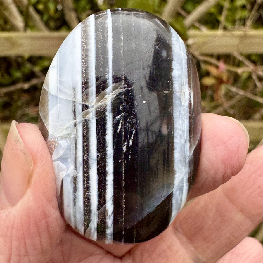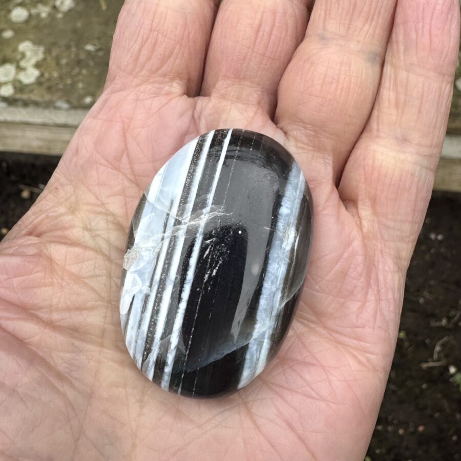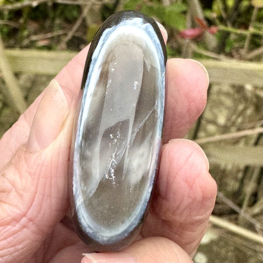 A distinctive piece. Blue opal is a crystal for restless minds and over-thinkers. It is a gentle form of common opal. The black adds emotional stability and grounding.
