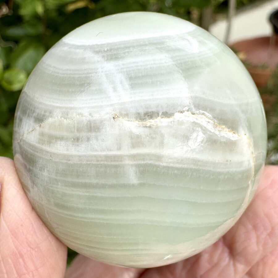 Pistachio is the description given to a type of green calcite found in Pakistan, characterised by its pistachio green colour with clear white and brown banding. This sphere looks like a patchwork of all the different shades of this crystal. One side is bright green, turn it round and you will find what looks like an eye.