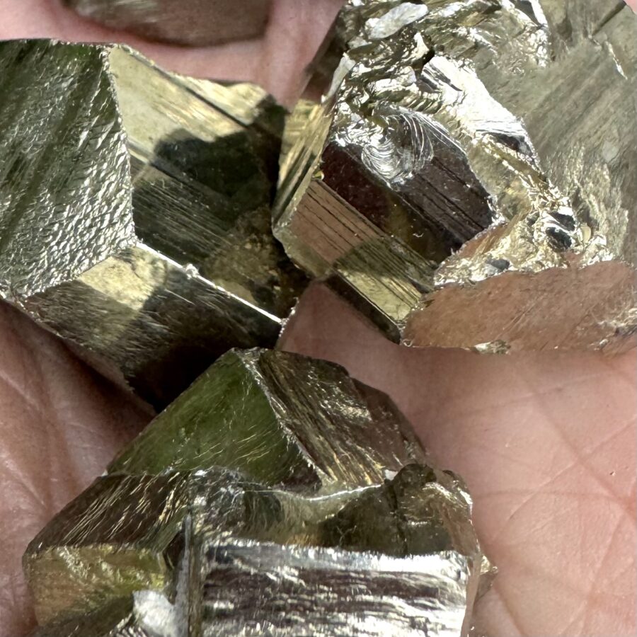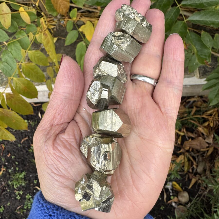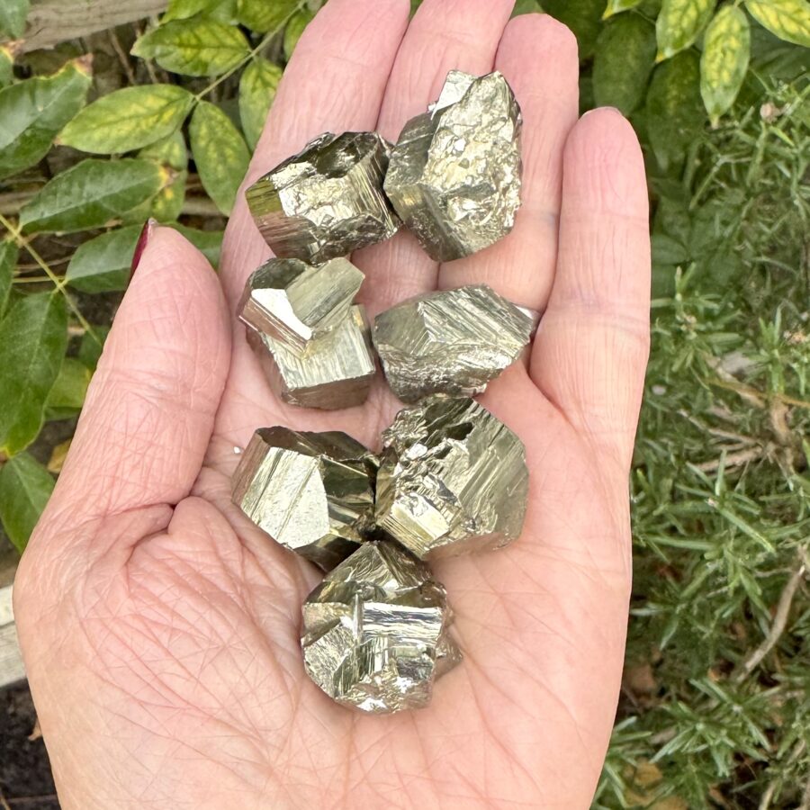 Pyrite is also known as fool’s gold, or iron pyrite, because of its high iron content. It naturally occurs in a cube form – these are all natural shapes.