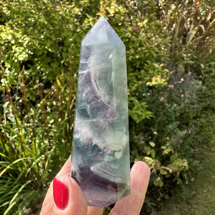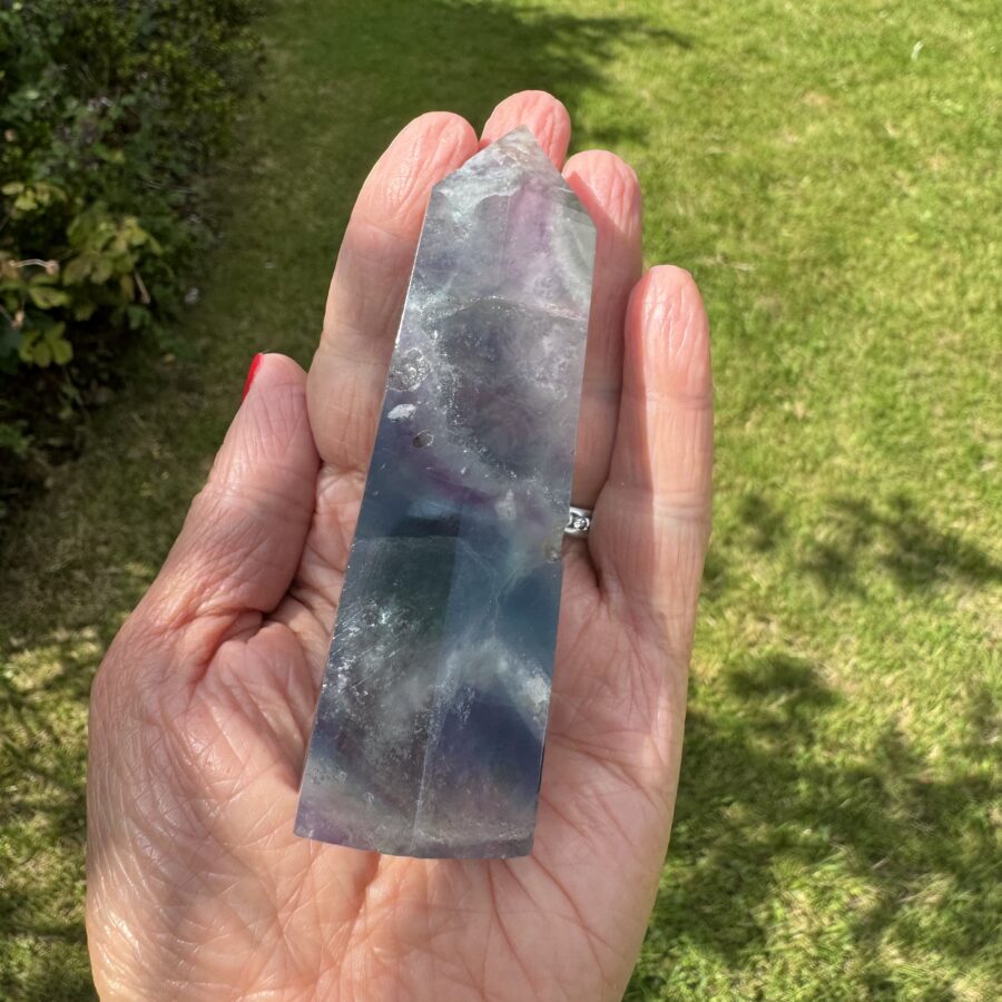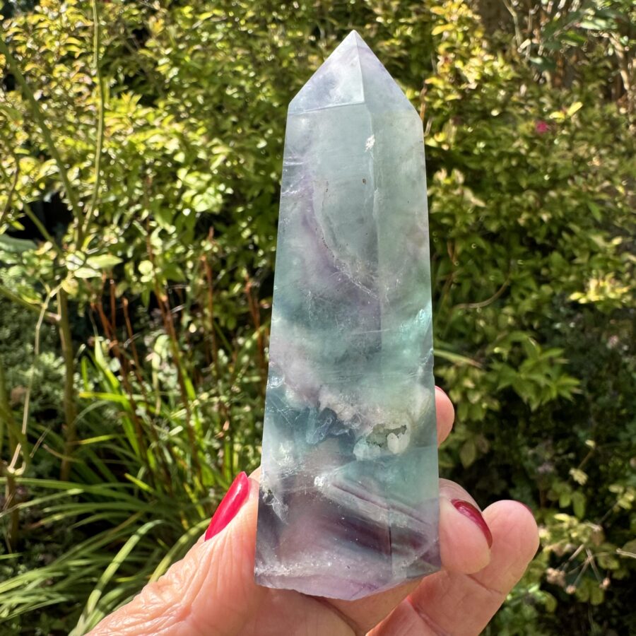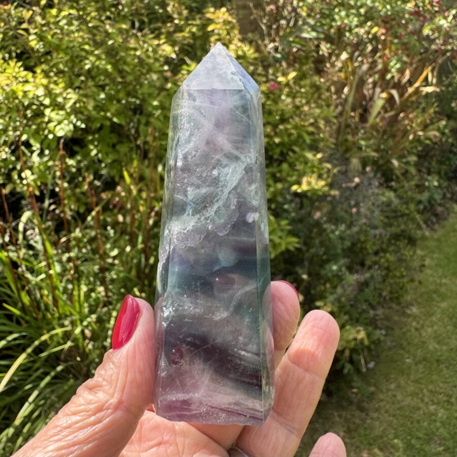 This large point has beautiful banding plus some druzy – a layer of smaller crystals growing inside. Every colour in rainbow fluorite has a different mission. Purple and magenta work with the crown chakra for spiritual development. Green works with the heart chakra for emotional healing, while blue works with the third eye and throat for clarity, intuition and self-expression.